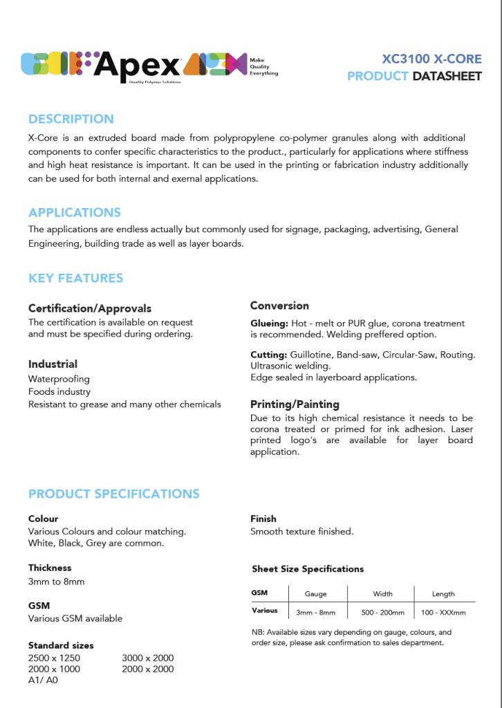Durability: X-CORE™ is highly durable and can hold up well against harsh weather conditions, moisture, and rough handling. This makes it an ideal material for outdoor signage and industrial packaging.